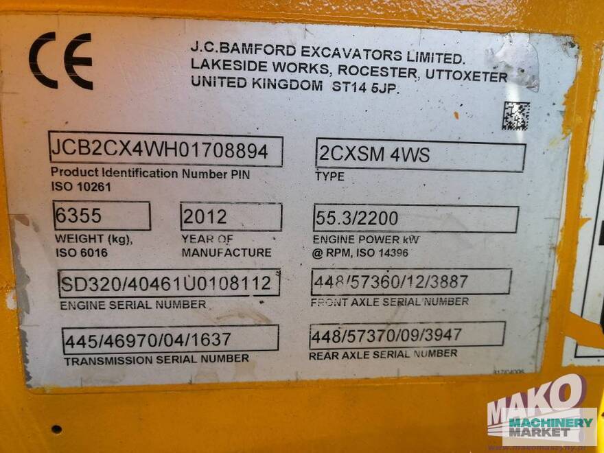 Gross weight : 14,010 lbs , Engine power : 75 hp (55 kW) , Transport dimensions (LxWxH) : 212.6x72.83x107.09 inches , Additional information : JCB 2CX SM 4WS , Rok produkcji 2012r , Waga 6355 kg , Moc silnika 55,3 kW/ 75 KM , Wymiary dł./szer./wys. 5,40x1,85x2,72 m , s/n JCB2CX4WH01708894 , Koparko-ładowarka posiada hydrauliczna łyżkę podsiębierna (krokodyl)